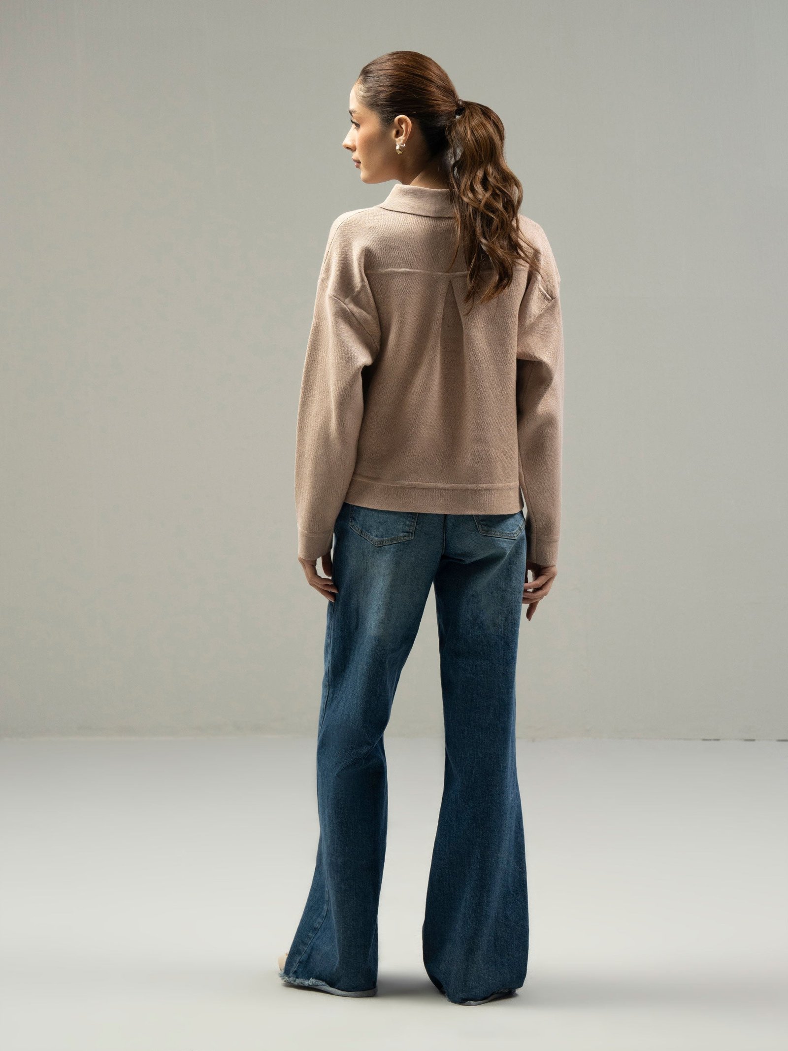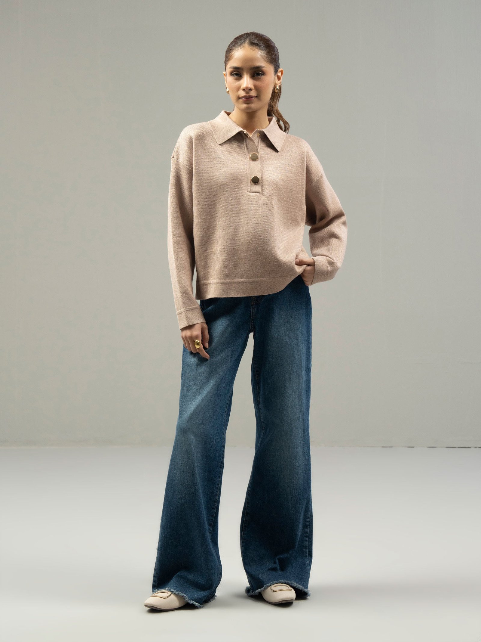 • Knitted crop sweater with a collar neck and button detailing on placket